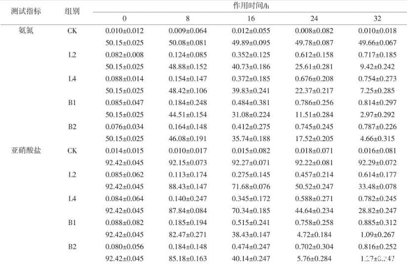 測(cè)試指標(biāo)組別作用時(shí)間/h 0 8 16 24 32氨氮CK 0.010±0.012 0.009±0.064 0.012±0.055 0.008±0.082 0.010±0.018 50.15±0.025 50.08±0.081 49.89±0.095 49.78±0.087 49.66±0.067 L2 0.082±0.008 0.124±0.085 0.352±0.125 0.612±0.158 0.717±0.185 50.15±0.025 48.88±0.152 40.73±0.186 25.61±0.281 9.42±0.242 L4 0.088±0.014 0.154±0.147 0.372±0.185 0.676±0.208 0.754±0.273 50.15±0.025 48.42±0.106 39.83±0.241 22.37±0.217 7.25±0.285 B1 0.085±0.047 0.184±0.248 0.484±0.381 0.786±0.256 0.814±0.297 50.15±0.025 44.51±0.154 31.08±0.224 11.51±0.284 2.97±0.292 B2 0.076±0.034 0.164±0.148 0.412±0.275 0.745±0.245 0.787±0.226 50.15±0.025 46.08±0.191 35.74±0.188 17.52±0.205 4.66±0.315亞硝酸鹽CK 0.014±0.015 0.010±0.017 0.015±0.082 0.018±0.071 0.016±0.081 92.42±0.045 92.15±0.073 92.27±0.071 92.22±0.081 92.29±0.072 L2 0.085±0.062 0.113±0.174 0.275±0.145 0.457±0.214 0.614±0.177 92.42±0.045 88.43±0.147 71.68±0.076 50.52±0.247 33.48±0.078 L4 0.084±0.064 0.140±0.247 0.345±0.172 0.588±0.271 0.782±0.245 92.42±0.045 87.84±0.084 70.34±0.185 44.64±0.234 28.82±0.247 B1 0.088±0.082 0.185±0.194 0.515±0.241 0.758±0.258 0.885±0.312 92.42±0.045 82.47±0.271 38.43±0.147 4.72±0.184 1.09±0.267 B2 0.080±0.056 0.184±0.148 0.474±0.247 0.702±0.304 0.816±0.252 92.42±0.045 85.18±0.163 40.14±0.247 5.76±0.284 1.27±0.247