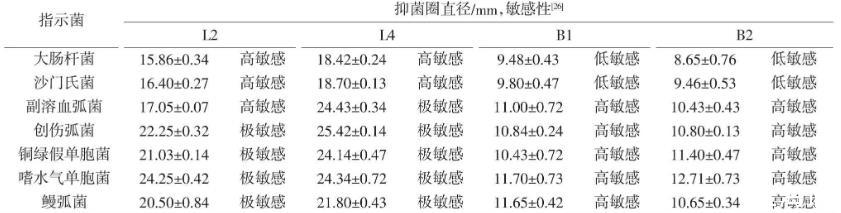 將分別培養(yǎng)24 h的L2、L4、B1與B2菌株發(fā)酵液對(duì)7種水產(chǎn)常見(jiàn)病原菌進(jìn)行抑制試驗(yàn)。結(jié)果表明,4株菌株對(duì)7種病原菌均表現(xiàn)出一定程度的抑制效果,其中L2、L4對(duì)大腸桿菌與沙門(mén)氏菌表現(xiàn)出高敏感,對(duì)3株弧菌與2株單胞菌表現(xiàn)出極敏感。而B(niǎo)1、B2對(duì)大腸桿菌與沙門(mén)氏菌表現(xiàn)出低敏感,對(duì)3株弧菌與2株單胞菌表現(xiàn)出高敏感,且乳酸菌L2、L4的抑菌效果優(yōu)于芽孢桿菌B1、B2,具體試驗(yàn)結(jié)果與抑菌效果見(jiàn)表1。