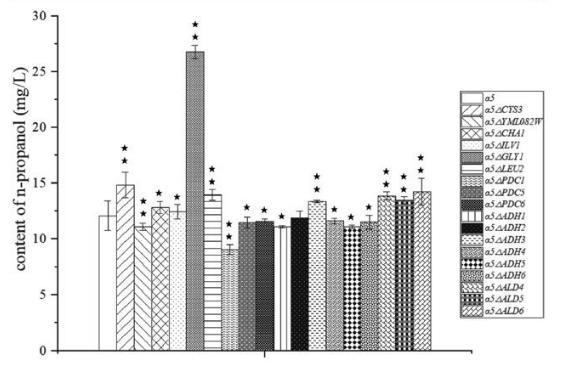 圖2、每個(gè)重組菌株和親本菌株α5中的正丙醇含量。發(fā)酵后測(cè)定各重組菌株的正丙醇產(chǎn)量,研究代謝途徑基因敲除對(duì)酵母菌生產(chǎn)正丙醇的影響。結(jié)果表明,除α5ΔTHR 1、α5ΔTHR 4和α5ΔTHR 6外,所有重組菌株均能順利發(fā)酵。