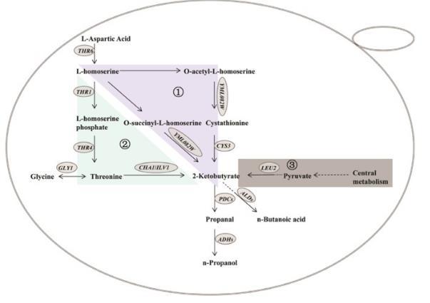 圖1、釀酒酵母中正丙醇的代謝途徑。圖中的三個(gè)色塊顯示了釀酒酵母中與正丙醇代謝相關(guān)的三個(gè)途徑,分別是L-高絲氨酸、蘇氨酸和丙酮酸途徑。小橢圓形圓圈中的基因分別被刪除。