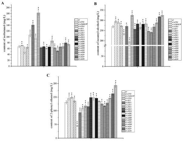 圖5、重組菌株和親本菌株α5的高級(jí)醇的形成。(A)各重組菌株中異丁醇和α5的含量。(B)各重組菌株和α5中異戊醇的含量。(C)各重組菌株中2-苯乙醇的含量和α5。誤差條代表三個(gè)重復(fù)發(fā)酵實(shí)驗(yàn)數(shù)據(jù)的標(biāo)準(zhǔn)偏差。