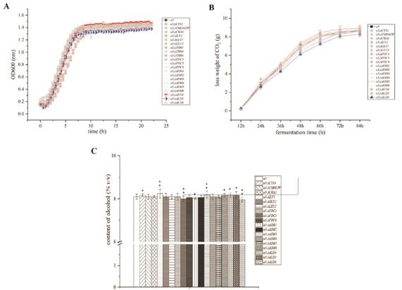 圖4、重組菌株和親本菌株α5的生長(zhǎng)和發(fā)酵特性。(A)重組菌株和α5的生長(zhǎng)曲線。(B)各重組菌株和α5的CO2排放量。(C)每個(gè)重組菌株和α5的酒精含量。誤差條代表三個(gè)重復(fù)發(fā)酵實(shí)驗(yàn)數(shù)據(jù)的標(biāo)準(zhǔn)偏差。Bioscreen全生長(zhǎng)曲線分析儀用于測(cè)定親本菌株α5和各突變株在YEPD液體培養(yǎng)基中的生長(zhǎng)曲線,研究正丙醇代謝途徑中正丙醇代謝相關(guān)基因缺失對(duì)酵母菌生長(zhǎng)的影響。從生長(zhǎng)曲線的整體趨勢(shì)來(lái)看,突變體的生長(zhǎng)趨勢(shì)與α5基本相同。除了處于穩(wěn)定期的α5ΔALD 4和α5ΔALD 5外,在突變體之間沒有觀察到細(xì)胞密度的明顯差異。這表明正丙醇代謝途徑相關(guān)基因的缺失對(duì)釀酒酵母的生長(zhǎng)性能沒有不利影響。