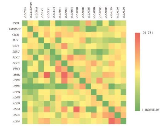 圖3、突變體和α5基因表達(dá)水平的測(cè)定。每行代表與親本菌株α5相比,每個(gè)重組菌株中每個(gè)靶基因的表達(dá)水平。紅色和綠色表示與對(duì)照相比,靶基因的表達(dá)水平分別上調(diào)和下調(diào)。深色表示大幅上調(diào)或下調(diào)。與α5相比,最大上調(diào)和下調(diào)倍數(shù)分別為21.731和1.18064×10–6。