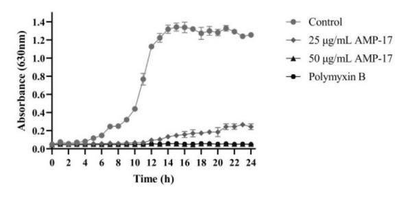 與不同濃度的AMP-17共同置于37℃孵育24小時,每小時測定一次630nm處的吸光度值,記錄結(jié)果并繪制生長曲線;