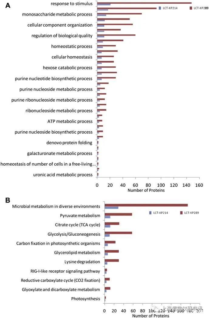 圖5、圖a和圖b表示的是太空飛行的肺炎克雷伯菌株LCT-KP289差異表達蛋白的GO富集分析和KEGG通路富集分析,對照染色體為LCT-KP214。紅色和藍色列分別表示LCT-KP289和LCT-KP214。注釋軸按功能分類示意圖。這些列表標注了菌株中所有帶注釋的蛋白的數(shù)量。