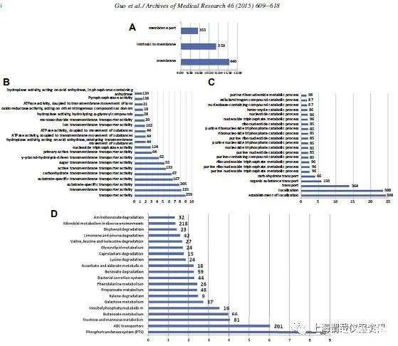 圖3、圖(A)表示的是肺炎克雷伯菌株菌株的相關(guān)成分分析。圖B和圖C表示的集群過程本體。圖D表示的是KEGG通路分析。在圖A、B、C、D中,注釋軸按功能項進行分類。這些列表展示的是所有菌株中帶注釋基因的數(shù)量。