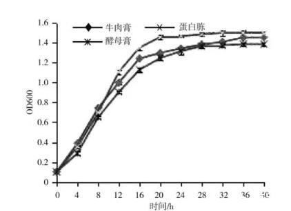 不同N源的培養(yǎng)結(jié)果表明:牛肉膏、酵母膏和蛋白胨均可作為FCX2菌株的氮源,且蛋白胨為氮源時(shí)FCX2菌株的生長(zhǎng)速率最快,且到穩(wěn)定期時(shí)OD可達(dá)到1.463 7;酵母膏為氮源時(shí),菌液達(dá)穩(wěn)定期時(shí)OD值為1.456 1,但差別并不顯著;牛肉膏為氮源時(shí),菌液達(dá)穩(wěn)定期時(shí)OD值為1.384 2,且較上述兩者差異顯著,而從該生長(zhǎng)曲線同樣可看出,該菌的生長(zhǎng)速率也較慢。
