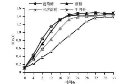 碳源培養(yǎng)試驗(yàn)結(jié)果表明:以葡萄糖為碳源時(shí),F(xiàn)CX2菌株生長(zhǎng)速率較快,而牛肉膏為碳源時(shí),雖然生長(zhǎng)速率略低于葡萄糖,但FCX2菌株在穩(wěn)定期OD值卻可以達(dá)到最大的1.493 1,但以淀粉為碳源時(shí),無(wú)論生長(zhǎng)速率還是穩(wěn)定期OD值均要比前三者三種碳源低,綜合考慮認(rèn)為葡萄糖為最適碳源,淀粉最不適于作為FCX2的碳源。