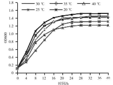 不同溫度下的生長(zhǎng)情況:按10%的接種量接入對(duì)數(shù)期FCX2菌株培養(yǎng)液于牛肉膏蛋白胨液體培養(yǎng)基內(nèi),分別放入20、25、30、35℃和40℃,150 r·min-1條件下培養(yǎng),利用紫外分光光度計(jì)每隔4 h測(cè)定OD值,波長(zhǎng)600 nm,3次重復(fù)[7-8]。