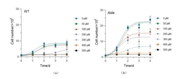 將處理好的細(xì)胞放置在光照培養(yǎng)箱內(nèi)光周期培養(yǎng),然后按1、2、3、4天的時(shí)間點(diǎn)取樣計(jì)數(shù),繪制生長(zhǎng)曲線,結(jié)果如圖2所示。從圖中可以看出,發(fā)現(xiàn)Aida基因突變型萊茵衣藻具有高生長(zhǎng)速率,且具有較高的銅離子耐受性;野生型WT藻株生長(zhǎng)速率較慢,且容易受到銅離子的生長(zhǎng)抑制作用。
