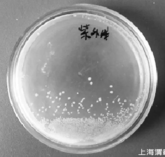 在紫外線殺菌試驗中,經(jīng)紫外線照射30 min、培養(yǎng)24 h后,被皿蓋遮住的瓊脂表面菌苔呈半圓形生長,暴露于紫外燈下的部分無細菌生長,界限較為清晰。隨著對菌液的繼續(xù)培養(yǎng),界限開始不太清楚,有些照射過紫外線的地方也開始有細菌菌落,而且菌落相對較大,見圖1。