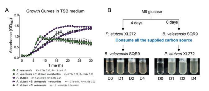 圖2、(A)在純TSB培養(yǎng)基中培養(yǎng)的單一培養(yǎng)物(正方形)、在添加了10%其他物種上清液的TSB上生長(zhǎng)的單一培養(yǎng)物(圓形)和共培養(yǎng)物(六邊形)的生長(zhǎng)曲線。芽孢桿菌SQR9 TSB用過(guò)的培養(yǎng)基促進(jìn)了施氏假單胞菌XL272的生長(zhǎng)。“K”表示生長(zhǎng)能力,“R”表示生長(zhǎng)速率,由生長(zhǎng)曲線的R包計(jì)算得出。(B)M9用過(guò)的培養(yǎng)基實(shí)驗(yàn)的示意圖。分離物在M9葡萄糖培養(yǎng)基中獨(dú)立生長(zhǎng)6天(芽孢桿菌SQR9)或4天(施氏假單胞菌XL272)直到檢測(cè)到葡萄糖,然后從懸浮液中濾出細(xì)胞。