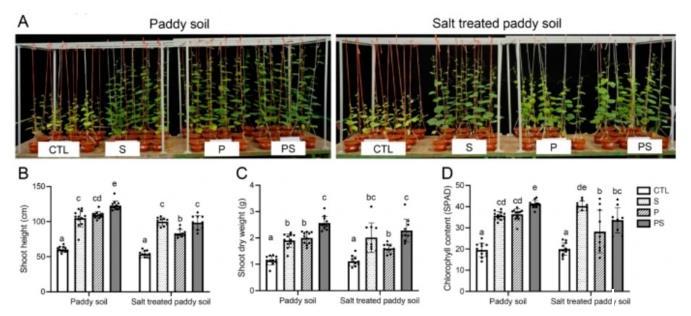 圖3、聯(lián)合體促進(jìn)植物生長(zhǎng)并緩解鹽脅迫。(A)照片顯示了在普通稻田土壤或鹽處理稻田土壤中種植的6周齡黃瓜植株,接種了S(B.velezensis SQR9)、P(P.stutzeri XL272)或PS(P和S的混合物)。CTL代表在沒(méi)有接種細(xì)菌的普通土壤中生長(zhǎng)的植物。(B)植物的拍攝高度。(C)枝條干重。(D)植物的葉綠素含量。
