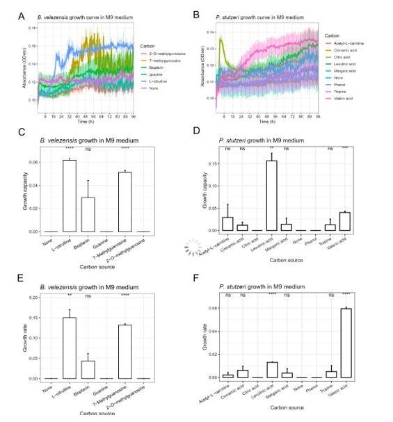 圖5、單個(gè)微生物的生長(zhǎng)動(dòng)力學(xué)。(A和B)在M9培養(yǎng)基中以相應(yīng)化合物作為唯一碳源對(duì)芽孢桿菌SQR9和施氏假單胞菌XL272的生長(zhǎng)曲線進(jìn)行研究。(C&D)生長(zhǎng)能力是最大的種群規(guī)模。該值為最大OD600值減去初始OD600值。(E&F)增長(zhǎng)率是指數(shù)階段生長(zhǎng)曲線的斜率。給出的數(shù)據(jù)為平均值±標(biāo)準(zhǔn)差(n=5)。誤差條代表標(biāo)準(zhǔn)偏差。
