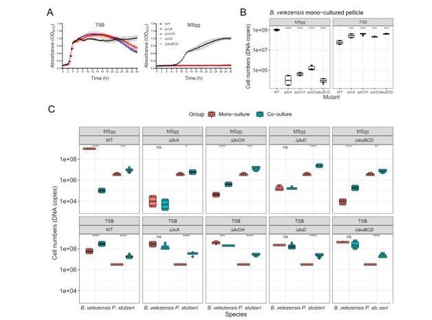 圖4、合成BCAA的能力是貝氏芽孢桿菌SQR9在最小培養(yǎng)基中生存的必要條件,但在豐富培養(yǎng)基中是必不可少的。(A)B.vele zensisBCAAs生物合成突變體的生長(zhǎng)曲線(B)芽孢桿菌zensisBCAAs生物合成突變體在單培養(yǎng)膜中的細(xì)胞數(shù)量。星號(hào)表示與野生型相比具有統(tǒng)計(jì)學(xué)意義(p<0.01)。(C)雙種生物膜細(xì)胞數(shù),上標(biāo)題為中型,下標(biāo)題為芽孢桿菌突變體。