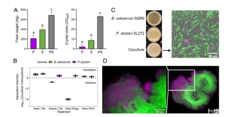 圖1、施氏假單胞菌XL272和芽胞桿菌SQR9在某些條件下協(xié)同形成生物膜。通過(guò)鮮重和結(jié)晶紫測(cè)定法定量生物膜生物量。(A)生物膜在靜態(tài)TSB培養(yǎng)基中培養(yǎng)。P代表施氏假單胞菌XL272單培養(yǎng)薄膜,S代表芽胞桿菌SQR9單培養(yǎng)薄膜,PS代表共培養(yǎng)薄膜。條形代表平均值±sd(n=6)。根據(jù)方差分析,通過(guò)Prism 8進(jìn)行的Tukey檢驗(yàn),不同的字母表示具有統(tǒng)計(jì)學(xué)意義的差異。(B)相互作用強(qiáng)度定義為共培養(yǎng)中DNA拷貝相對(duì)于單一培養(yǎng)中平均DNA拷貝的對(duì)數(shù)刻度。靜態(tài)TSB和靜態(tài)REM(根系分泌物培養(yǎng)基)代表結(jié)構(gòu)化、營(yíng)養(yǎng)豐富的條件,搖動(dòng)的TSB代表非結(jié)構(gòu)化、營(yíng)養(yǎng)豐富的條件,靜態(tài)MSgg代表結(jié)構(gòu)化、營(yíng)養(yǎng)有限的條件。合作只發(fā)生在結(jié)構(gòu)化、營(yíng)養(yǎng)豐富的條件下。(C)TSB培養(yǎng)基中單一培養(yǎng)和共培養(yǎng)的生物膜形成。在CLSM下觀察由施氏假單胞菌XL272(洋紅色)和芽胞桿菌SQR9(綠色)形成的生物膜。井徑為15.6毫米。(D)在TSB瓊脂上生長(zhǎng)的菌落。DsRed標(biāo)記的施氏假單胞菌XL272被染成洋紅色,GFP標(biāo)記的芽胞桿菌SQR9被染成綠色。