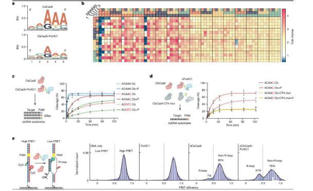 圖3、PcrIIC1增強(qiáng)CbCas9的體外DNA干擾活性。a,CbCas9和CbCas9-PcrIIC1 PAM偏好的WebLogo圖。數(shù)據(jù)代表具有相似結(jié)果的三個(gè)獨(dú)立實(shí)驗(yàn)。b,熱圖顯示CbCas9-PcrIIC1和CbCas9之間PAM偏好的倍數(shù)變化。與CbCas9組相比,較暖的顏色表明CbCas9-PcrIIC1組對PAM的偏好增加。c,CbCas9和CbCas9-PcrIIC1效應(yīng)子對含有各種PAM(ACAAA、ACAAC和ACGTC)的靶dsDNA進(jìn)行體外切割的模型(左)和效率圖(右);在0、2、5、15、30、60、90和120分鐘時(shí)收集等分試樣。數(shù)據(jù)為平均值±標(biāo)準(zhǔn)差(n=3個(gè)獨(dú)立重復(fù))。CbCas9的每個(gè)PAM的平臺值分別為66.88、46.98和26.77,CbCas9-PcrIIC1的每個(gè)PAM的平臺值分別為71.84、65.37和53.15。Cb和Cb+P分別表示CbCas9和CbCas9-PcrIIC1效應(yīng)子。d,使用CbCas9和CTH突變的CbCas9(CbCas9-CTH mut;K1431E、K1433E、K1435E和R1442E)使用ACAAC PAM對目標(biāo)dsDNA進(jìn)行的模型(左)和切割效率圖(右),在有或沒有PcrIIC1的情況下孵育;在0、2、5、15、30、60、90和120分鐘時(shí)收集等分試樣。數(shù)據(jù)為平均值±標(biāo)準(zhǔn)差(n=3個(gè)獨(dú)立重復(fù))。Cb-CTH mut和Cb-CTH mut+P分別表示CTH突變的CbCas9和CTH突變的CbCas9-PcrIIC1效應(yīng)子。e,左圖,用于目標(biāo)dsDNA的R環(huán)形成的smFRET測定示意圖,其中TS上有Cy3標(biāo)記,NTS上有Cy5標(biāo)記。右圖為僅DNA、PcrIIC1、dCbCas9和dCbCas9-PcrIIC1樣品的FRET直方圖。