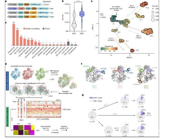 圖1、大型II-C Cas9與鄰近的NAG相關(guān)并表現(xiàn)出結(jié)構(gòu)生長軌跡。a)示意圖顯示已識別的II-A、II-B、II-C型和NAG相關(guān)II-C系統(tǒng)的CRISPR-Cas9系統(tǒng)的數(shù)量。顯示了GEM和HBGC數(shù)據(jù)集中已識別系統(tǒng)的數(shù)量。b)具有(NAG+)和不具有(NAG?)NAG的II-C Cas9的蛋白質(zhì)大小的比較。NAG+的中值為1,463個(gè)氨基酸,NAG?的中值為1,159個(gè)氨基酸。使用雙邊檢驗(yàn)進(jìn)行統(tǒng)計(jì)分析,并通過曼-惠特尼U檢驗(yàn)確定顯著性。c)所有已識別的NAG的功能注釋。具有核酸結(jié)合功能的NAG呈紅色。d)示意圖顯示了II-C Cas9結(jié)構(gòu)預(yù)測、量化和降維分析的工作流程。PCA,主成分分析。e)II-C Cas9s蛋白質(zhì)結(jié)構(gòu)的SGT分析平面。點(diǎn)的大小對應(yīng)于Cas9的大小,顏色對應(yīng)于SGT的偽時(shí)間。每個(gè)簇的標(biāo)簽根據(jù)軌跡著色。f)每個(gè)軌跡的高級簇中的代表性Cas9結(jié)構(gòu)。NAG+Cas9的比例標(biāo)記在頂部,不同簇中Cas9的總數(shù)標(biāo)記在每個(gè)簇的底部。