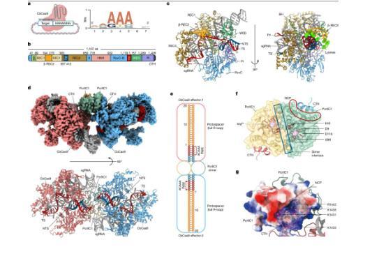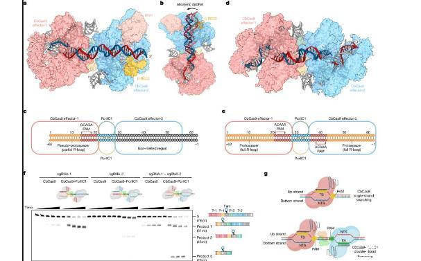 圖4:CbCas9-PcrIIC1復(fù)合物通過兩個(gè)CbCas9效應(yīng)子增強(qiáng)dsDNA篩選和dsDNA入侵能力。a,CbCas9-PcrIIC1-sgRNA-dsDNA非靶向復(fù)合物的結(jié)構(gòu)。蛋白質(zhì)以半透明冷凍電鏡圖顯示,核酸以原子模型顯示。b,a中CbCas9-PcrIIC1非靶向復(fù)合物的側(cè)視圖。B型DNA模擬物顯示為半透明模型。c,非靶向復(fù)合物中CbCas9-PcrIIC1與dsDNA靶標(biāo)結(jié)合的示意圖。d,CbCas9-PcrIIC1-sgRNA-dsDNA(對稱20-nt互補(bǔ))雙靶向復(fù)合物的結(jié)構(gòu)。蛋白質(zhì)以半透明冷凍電鏡圖顯示,核酸以原子模型顯示。e,雙靶向復(fù)合物中CbCas9-PcrIIC1結(jié)合dsDNA靶標(biāo)的示意圖。f,含有兩種不同原型間隔子(原型間隔子-1(紅色)和原型間隔子-2(藍(lán)色)的Fam標(biāo)記的靶dsDNA的體外切割。右下角是不同裂解產(chǎn)物的圖表。g,示意圖顯示CbCas9的單鏈搜索和CbCas9-PcrIIC1復(fù)合物的雙鏈搜索。