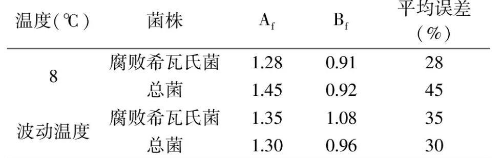 表4 8℃、波動溫度下模型預(yù)測準(zhǔn)確度(Af)與偏差度(Bf)比較