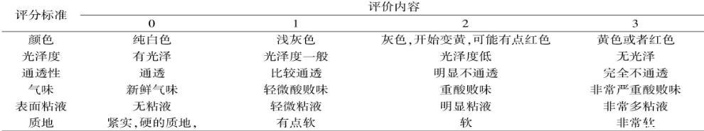 1.2.3.1感官評價(jià)感官評價(jià)采用質(zhì)量指數(shù)法(Quality Index Method,QIM),參照朱志偉等的方法并作適當(dāng)修改:評定小組由6名經(jīng)過培訓(xùn)的人員組成。隨機(jī)抽取魚肉樣品,對魚肉的顏色、光澤度、通透性、氣味、表面粘液和質(zhì)地進(jìn)行評價(jià),每項(xiàng)評價(jià)指標(biāo)總分在0~3間,評分標(biāo)準(zhǔn)見表1。每個(gè)參數(shù)總得分即為其感官分值。