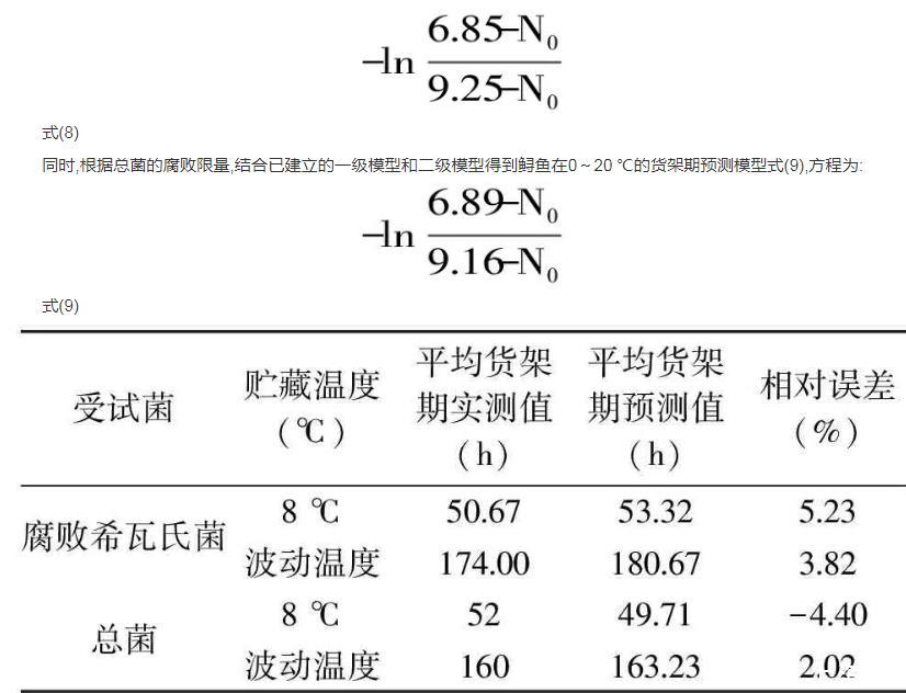 1.2.6鱘魚貨架期預(yù)測及驗(yàn)證將在8℃和波動溫度下托盤包裝的鱘魚實(shí)際貨架期與預(yù)測貨架期進(jìn)行比較,驗(yàn)證其可靠性。