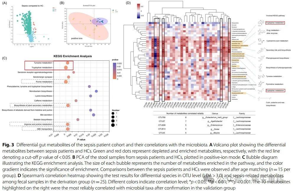 差異代謝物似乎與氨基酸代謝密切相關,包括色氨酸、酪氨酸、精氨酸和脯氨酸代謝。參與不平衡的嘌呤代謝、植物次生代謝物的生物合成和ABC轉運蛋白也被觀察到。考慮到腸道微生物和代謝物之間的密切聯系,我們評估了改變的分類群與膿毒癥相關代謝物的相關性(圖3D)。發(fā)現多種細菌與這些關鍵代謝物密切相關。在前五名中,有四名屬于毛螺菌科,表明該細菌家族具有強大的代謝調節(jié)功能。值得注意的是,OTU808(Enterococcus faecium)與代謝物幾乎呈負相關,這與上述腸球菌與膿毒癥腸道微環(huán)境中其他細菌的抑制關系類似。此外,我們還鑒定了10種與細菌最密切相關的代謝物:3-甲基二氧吲哚、5-羥基吲哚乙酸、多巴醌、N,N-二羥基苯基丙氨酸、異煙酸、脫氧膽酸、2-羥基肉桂酸、4-羥基苯甲醛、胸腺嘧啶和十六烯二酸。其中6種是芳香化合物,可能來源于芳香氨基酸(AAA)的代謝物,包括色氨酸、酪氨酸和苯丙氨酸。其中,參與色氨酸代謝的代謝物3-甲基二氧吲哚與膿毒癥患者腸道微生物的相關性最大。
