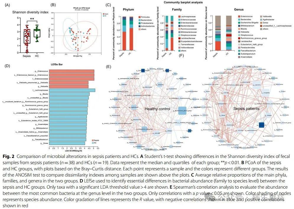 首先,我們比較了膿毒癥組和HC組之間的α多樣性和β多樣性。膿毒癥患者的腸道α多樣性明顯低于HCs患者(Shannon指數2.146 vs.2.911,p<0.01;圖2A)和不同的微生物結構(ANOSIM檢驗,p=0.001;圖2B)。膿毒癥和HCs組流行菌分布如圖2C所示。膿毒癥患者的變形菌門和腸球菌科數量增加,厚壁菌門和毛螺桿菌科數量明顯減少。LefSe發(fā)現,膿毒癥患者的健康促進菌群(如Blautia、Anaerostipes、Bifdobacterium和Eubacterium_hallii)豐度也顯著減少。相反,醫(yī)院內感染常見的腸球菌(Enterococcus)和克雷伯菌(Klebsiella)在膿毒癥患者中的富集程度高于HCs(圖2C,D)。此外,與HC相比,膿毒癥患者的細菌關系網絡不那么復雜,其中腸球菌對其他分類群表現出異常的抑制作用(圖2E)。