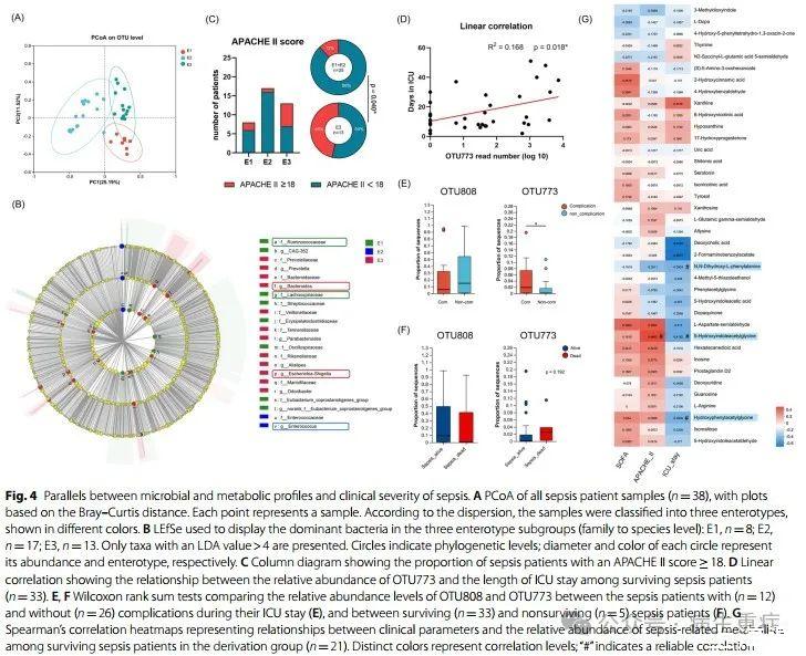 接下來研究了腸道微生物組和代謝物對膿毒癥嚴重程度的潛在影響。如圖4A所示,該組患者根據其腸道微生物組成(也稱為腸型)大致可分為三個亞組。在腸型1(E1)中占優(yōu)勢的是毛螺科和瘤胃球菌科;腸型2(E2)以腸球菌為主;腸型3(E3)富含擬桿菌和志賀氏桿菌(圖4B)。腸型比較顯示,E3期患者最為關鍵,APACHE II評分≥18的比例明顯高于非E3期患者(46%vs.12%,p=0.040;圖4C)。此外,E3組患者SOFA評分≥10分、ICU住院≥30天的比例可能更高,死亡率也最高,但差異無統(tǒng)計學意義。盡管E2組患者細菌多樣性和豐富度似乎低于其他腸型,但疾病并不比其他腸型更嚴重。