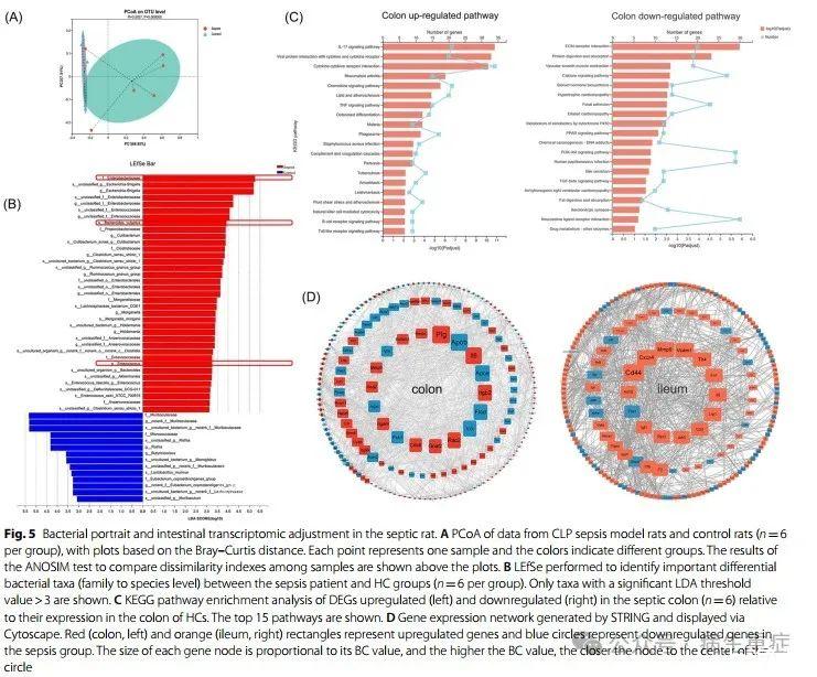 為了進一步闡明膿毒癥相關關鍵細菌的功能,我們評估了細菌豐度譜與腸道基因表達譜之間的關系。最初,我們重點研究了膿毒癥大鼠腸道轉錄組的變化。通過KEGG分析來確定DEGs的功能富集(圖5C)。對于回腸和結腸,發(fā)現大量在膿毒癥中上調的基因參與了細胞因子-細胞因子受體相互作用和趨化因子信號通路,反映在免疫激活上。多種細胞粘附分子在膿毒癥結腸中下調,表現為細胞外基質(ECM)受體與轉化生長因子-β信號通路相互作用的功能減弱,這有助于免疫細胞的募集和腸道通透性的增強。另一個顯著的變化是脂質代謝途徑。許多下調的基因與類固醇激素的生物合成、過氧化物酶體增殖物激活受體(PPAR)信號通路和膽固醇代謝有關。膽固醇是幾種具有抗炎功能的激素的前體,脂肪酸及其衍生物可激活PPAR信號通路,有效改善膿毒癥的炎癥損傷。此外,與外源性藥物代謝相關的通路在膿毒癥中也減弱了。該通路通過腸道代謝物激活芳烴受體(AhR)和孕烷X受體(PXR),隨后與核因子-κB信號轉導相互作用,發(fā)揮抗炎功能。