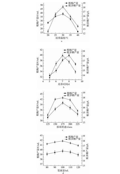 圖1培養(yǎng)溫度、培養(yǎng)時(shí)間、搖床轉(zhuǎn)速、裝液量對(duì)粗酶和多糖產(chǎn)量的影響