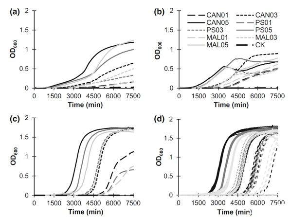 圖1、在優(yōu)化合成葡萄汁期間獲得的生長(zhǎng)曲線,使用BioscreenC全自動(dòng)生長(zhǎng)曲線分析儀測(cè)定清酒假絲酵母菌CPA-1在培養(yǎng)基中的生長(zhǎng)曲線:a)用半固體培養(yǎng)基在不搖動(dòng)的情況下獲得的平均生長(zhǎng)曲線(十個(gè)單獨(dú)的重復(fù));b)自動(dòng)讀數(shù)前20秒搖動(dòng)液體培養(yǎng)基獲得的平均生長(zhǎng)曲線(10次重復(fù));c)用連續(xù)搖動(dòng)的液體培養(yǎng)基獲得的平均生長(zhǎng)曲線(十個(gè)單獨(dú)的重復(fù));d使用液體介質(zhì)連續(xù)搖動(dòng)獲得的各個(gè)曲線,不同的虛線表示每種配方的不同濃度。