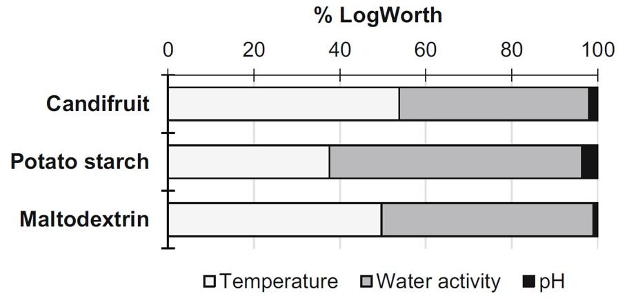 圖4、每種測(cè)試配方的總結(jié)效果:Candifruit、馬鈴薯淀粉和麥芽糖糊精。三種研究配方表示為L(zhǎng)ogWorth百分比值,以比較模型中的效果:溫度(填充淺灰色方塊)、水分活度(填充灰色方塊)和pH值(填充黑色方塊)。
