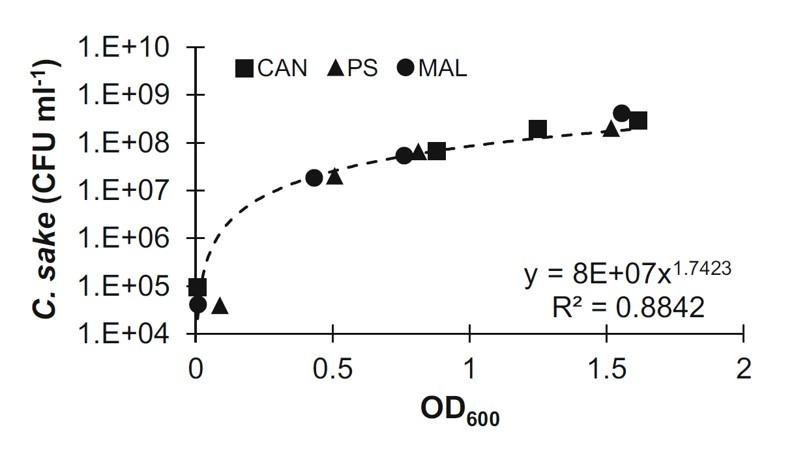 圖3、OD600和清酒假絲酵母菌(CFU ml-1)在不同生長(zhǎng)時(shí)間與初始接種量為105 CFU ml-1之間的相關(guān)性。代表了三種配方:Candifruit(■)、馬鈴薯淀粉配方(實(shí)心三角形▲)和麥芽糖糊精配方(●)。功率趨勢(shì)線用虛線表示。使用連續(xù)搖動(dòng)的液體SGJ培養(yǎng)基。
