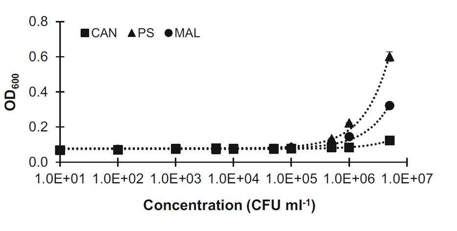 圖2、在優(yōu)化Bioscreen C全自動(dòng)生長(zhǎng)曲線分析儀測(cè)定中使用的接種物大小期間獲得的初始濁度值。代表了三種配方:Candifruit(■)、馬鈴薯淀粉配方(實(shí)心三角形▲)和麥芽糖糊精配方(●)。每個(gè)配方的線性回歸用虛線表示。使用具有連續(xù)振蕩處理的液體SGJ介質(zhì)。數(shù)值是接種后前10分鐘內(nèi)每2分鐘記錄的五個(gè)讀數(shù)的平均值,每種制劑使用三個(gè)孔。