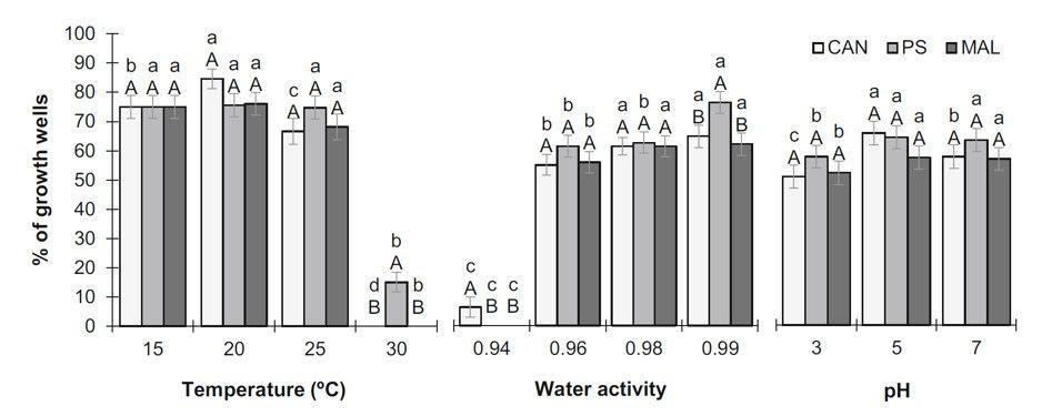 圖5、在每種評(píng)估條件(溫度、水分活度和pH值)下,清酒假絲酵母菌CPA-1實(shí)現(xiàn)生長(zhǎng)的接種孔百分比的圖形表示。每張圖中表示三種配方:Candifruit(■)、馬鈴薯淀粉配方(實(shí)心三角形▲)和麥芽糖糊精配方(●)。對(duì)于每種處理和來源,由相同字母鏈接的百分比值沒有顯著差異(P<0.05)根據(jù)正交對(duì)比分析。不同的大寫字母表示相同條件(溫度、水分活度或pH)下清酒假絲酵母菌CPA-1制劑之間的顯著差異。不同的小寫字母表示同一配方內(nèi)不同評(píng)估溫度、水分活度或pH條件之間的顯著差異。