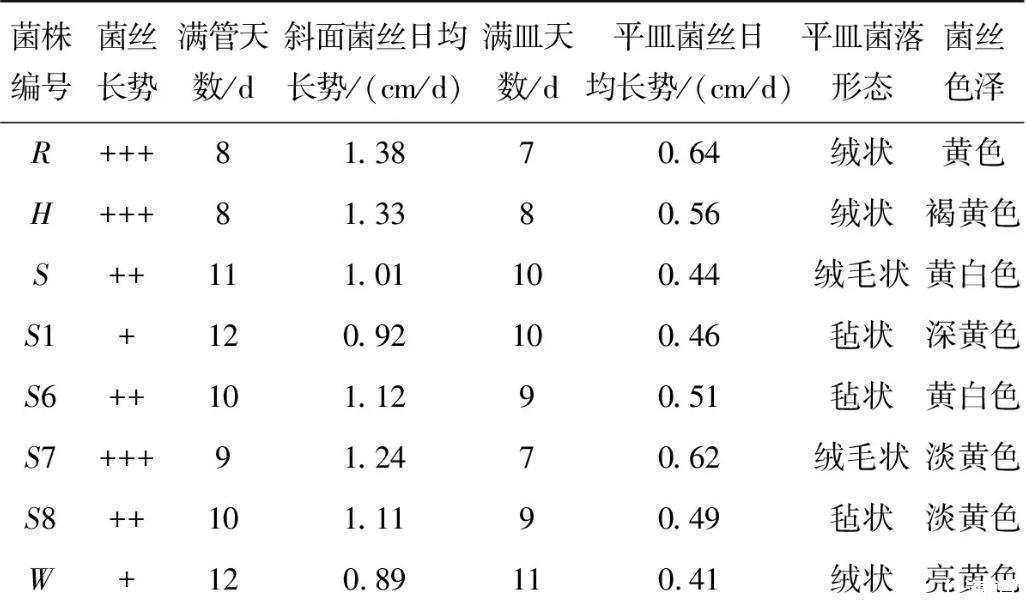 由圖1和表2可以看出,8個(gè)菌株中,R、H、S7的長(zhǎng)勢(shì)最好,其次為S、S6和S8.長(zhǎng)勢(shì)較好的菌株日平均生長(zhǎng)速度較快,長(zhǎng)勢(shì)弱的菌株生長(zhǎng)速度較慢。不同菌株的菌落形態(tài)及菌絲顏色也有差異,H、W、S8、S1的菌絲顏色較深,且易產(chǎn)生色素,S7和S菌絲生長(zhǎng)到后期表面會(huì)有油狀分泌物出現(xiàn),這些特征均是伴隨菌齡的增加而產(chǎn)生的。