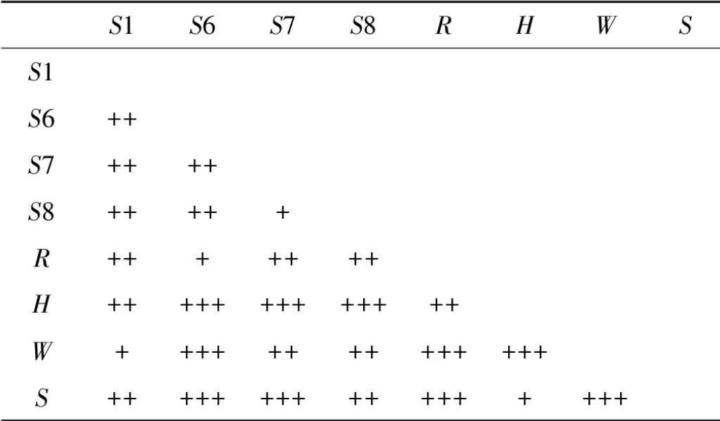 通過(guò)圖2和表3可以看出,S1與W;S6與R;S7與S8;H與S之間拮抗線不明顯,說(shuō)明它們之間的親緣性較近;而S6與H、W、S;S7與H、S;S8與H;R與W、S;H與W;W與S之間拮抗線明顯,親緣性較遠(yuǎn)。