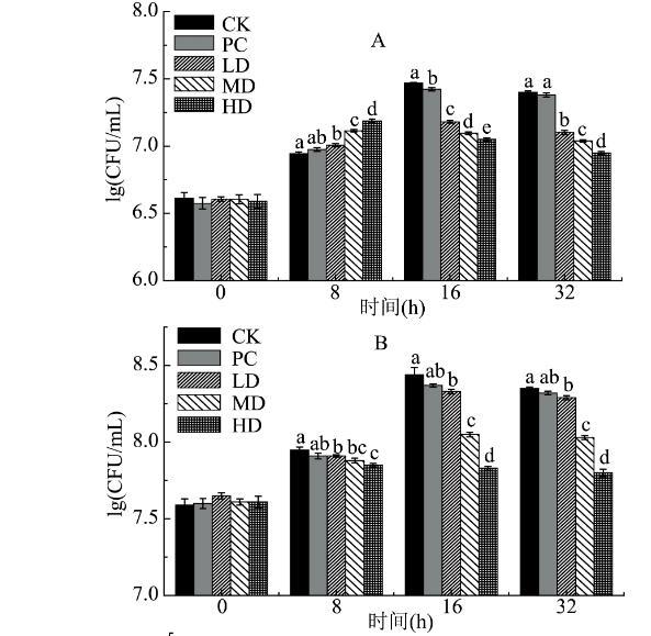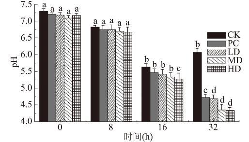 由圖2可知,各實(shí)驗(yàn)組pH變化趨勢(shì)均呈下降趨勢(shì),而對(duì)照組(CK)卻呈先下降后上升的趨勢(shì),這可能是由于隨著培養(yǎng)時(shí)間的增加,其菌群發(fā)生變化,使產(chǎn)酸菌群減少或氨類物質(zhì)增多而導(dǎo)致;另外,當(dāng)培養(yǎng)至32 h時(shí),其中PC組pH由7.21降到4.72,LD組pH由7.18降到4.68,MD組pH由7.09降到4.35,HD組pH由7.17降到4.33,各組pH下降程度高低為HD>MD>LD>PC>CK。酪蛋白組和不同劑量組的苦蕎蛋白組發(fā)酵液中的pH均低于空白對(duì)照組,且與其之間均具有顯著性差異(p<0.05)。在培養(yǎng)結(jié)束時(shí),不同劑量組的苦蕎蛋白組的發(fā)酵液pH與腸道中三種有害菌(腸球菌、腸桿菌、產(chǎn)氣莢膜梭菌)數(shù)量之間存在正相關(guān)關(guān)系,即發(fā)酵液pH越低,腸球菌、腸桿菌及產(chǎn)氣莢膜梭菌的數(shù)量越少。由此說明,有害菌生長(zhǎng)受到抑制可能是由于腸道菌群發(fā)酵苦蕎蛋白而產(chǎn)生短鏈脂肪酸等酸性物質(zhì),從而使腸道環(huán)境pH降低,這對(duì)于預(yù)防和治療腸道疾病具有重要意義。