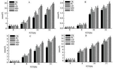 圖3苦蕎蛋白體外發(fā)酵對(duì)短鏈脂肪酸的影響注:A:乙酸;B:丙酸;C:丁酸;D:乳酸。