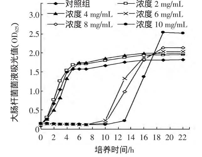 乳鐵蛋白在較低濃度(≤4 mg/mL)下,能促進E.coli生長,在較高濃度(≥6 mg/mL)時能表現(xiàn)出良好的抑菌作用;隨著培養(yǎng)時間的延長,不同濃度的乳鐵蛋白最終都能促進E.coli生長,同時,菌數(shù)的增幅高于空白組。