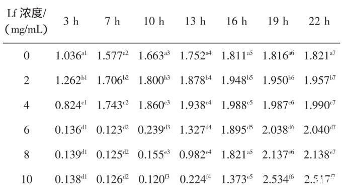 培養(yǎng)0~7 h時,在對照組、2 mg/mL組、4 mg/mL組中大腸桿菌的菌密度迅速上升,最先達到穩(wěn)定期;在濃度為6、8、10 mg/mL的3個組的菌數(shù)則無明顯變化;在7 h~22 h內(nèi),濃度為6、8、10 mg/mL 3個組的菌密度急速上升至穩(wěn)定期,并且蛋白濃度越大,上升的速率越快。培養(yǎng)結(jié)束時,所有實驗組的大腸桿菌菌液密度均大于對照組,并且添加的乳鐵蛋白濃度越大,最終的菌液濁度增幅度越大,與對照組差異顯著,結(jié)果見表2。