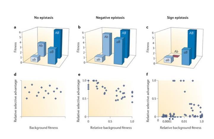 (a-c)遺傳學的上位效應根據(jù)其現(xiàn)象不同可以被分為正/負上位效應(Positive/Negative epistasis)、協(xié)同/拮抗上位效應(Synergistic/Antagonistic epistasis)、幅度/符號上位效應(Magnitude/Sign epistasis)等;(d-f)在不同的適應度背景下,某個突變對于整體適應度帶來的改變遵循某種統(tǒng)計學規(guī)律[3]