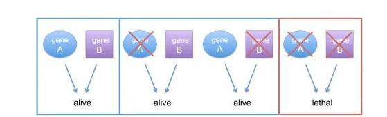 果蠅的合成致死性(Synthetic lethality)最早由美國遺傳學家卡爾文·布里奇斯(Clavin Bridges)于20世紀初發(fā)現(xiàn)[1]。在這個例子中。單獨突變基因A或基因B不會影響細胞或生物體的生存能力,只有當兩個特定的等位基因同時突變失活時才會導致死亡,這便是遺傳學中上位效應的一個具體體現(xiàn)[2]