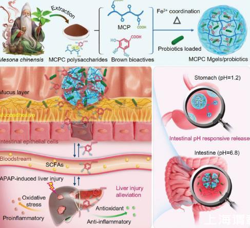 圖1、酚醛金屬配位框架穩(wěn)定的涼粉草多糖復(fù)合物(MCPC)微凝膠,用于控制釋放對乙酰氨基酚(APAP)誘導(dǎo)的肝損傷。采用MCP和棕色生物活性物質(zhì)組成的MCPC,通過離子配位制備微凝膠。微凝膠內(nèi)的棕色生物活性物質(zhì)-Fe 3+酚醛金屬骨架為微凝膠提供了機械結(jié)構(gòu)支撐。MCPC微凝膠表現(xiàn)出胃酸耐受性,有利于益生菌保護,并根據(jù)腸道pH值釋放益生菌。這有助于益生菌粘附、保留和定植于腸道。當(dāng)微凝膠解離時,棕色生物活性物質(zhì)依次釋放,吸附的半乳糖片段通過肝細胞半乳糖受體的識別,促進生物活性物質(zhì)進入肝臟。腸道中釋放的益生菌和肝臟中的棕色生物活性物質(zhì)的協(xié)同作用有助于減輕APAP引起的小鼠肝損傷。