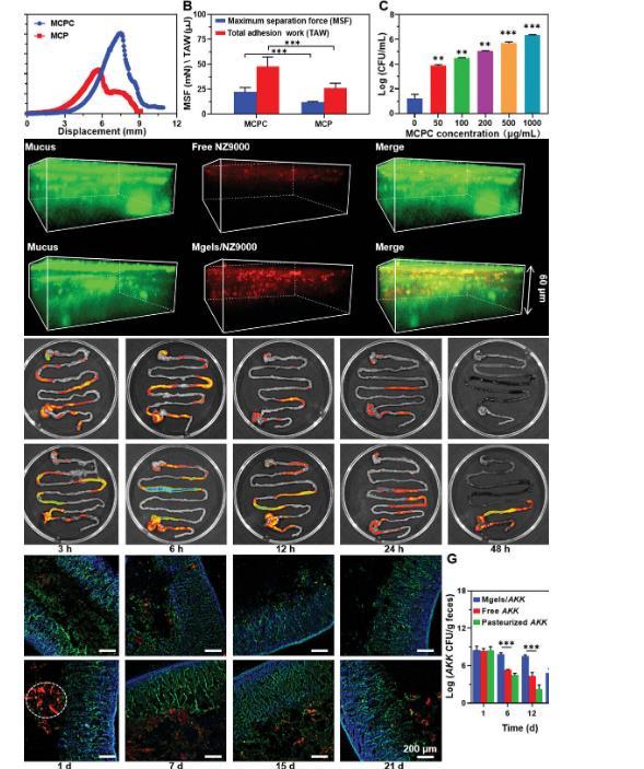 圖5、通過與MCPC介導(dǎo)的相互作用增強腸道粘膜粘附和益生菌定植。A)粘膜粘附曲線,B)MCPC和MCP對大鼠腸粘膜的最大分離力(MSF)和總粘附功(TAW)。C)MCPC濃度對粘液粘附益生菌影響的菌落計數(shù)。D)粘液(用綠色Alexa Fluor 488-WGA標(biāo)記)滲透無紅色和嵌入NZ9000的CLSM 3D圖像。E)FITC標(biāo)記的游離WCFS1或MCPC/WCFS1在胃腸道中的滯留。F)紅色游離NZ9000或MCPC/NZ9000在腸粘液中的分布??漳c粘液用綠色Alexa Fluor 488-WGA染色,腸絨毛細胞核用藍色DAPI染色。G)小鼠糞便中各種AKK的菌落計數(shù)。