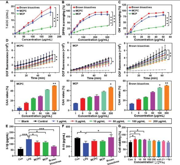 圖3、評估MCPC、MCP和棕色生物活性物質(zhì)的體外抗氧化、抗炎和細胞毒性特性。A)總抗氧化能力(T-AOC),B)DPPH自由基,C)MCPC、MCP和棕色生物活性物質(zhì)的羥基自由基清除能力。D)MCPC、MCP和棕色生物活性物質(zhì)的細胞抗氧化活性。使用MCPC、MCP和棕色生物活性物質(zhì)進行酶聯(lián)免疫吸附測定(ELISA),以檢查E)IL-1β和F)IL-10的水平。原始246.7細胞用MCPC、MCP和棕色生物活性物質(zhì)(200μg mL?1)預(yù)處理24小時。G)MCPC對Caco-2細胞的細胞毒性評估。