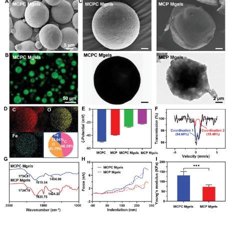 圖2、MCPC和MCP微凝膠的制備和表征。A)MCPC微凝膠的SEM。B)用羅丹明B染色的MCPC微凝膠的光學(xué)顯微鏡圖像。C)MCP和MCPC微凝膠的SEM和TEM。D)MCPC微凝膠的元素圖譜。E)MCPC、MCP及其微凝膠的z-電位。F)MCP微凝膠的穆斯堡爾譜。G)MCPC和MCP微凝膠的FT-IR光譜。H)納米壓痕力-距離曲線,I)MCPC和MCP微凝膠的楊氏模量。