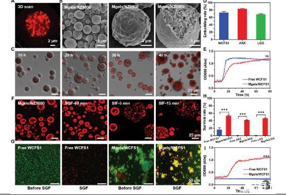 圖4、pH響應(yīng)型MCPC微凝膠可實現(xiàn)腸道響應(yīng)性釋放并增強益生菌的活力。A)CLSM和B)加載NZ9000(紅色)的MCPC微凝膠的SEM圖像。C)CLSM圖像顯示NZ9000在M17肉湯(pH 5.5)中的微凝膠中生長。D)微凝膠對各種益生菌的包封效率。E)Bioscreen C全自動生長曲線分析儀測試MRS肉湯中游離WCFS1和MCPC/WCFS1的生長曲線(80h)。F)MCPC/NZ9000微凝膠在SGIF中處理前后的熒光圖像。G)活細胞(綠色)/死細胞(紅色)活力,H)存活計數(shù),I)Bioscreen C全自動生長曲線分析儀測試游離WCFS1和MCPC/WCFS1在SGF處理前和處理30分鐘后的對應(yīng)的生長曲線((80h))。