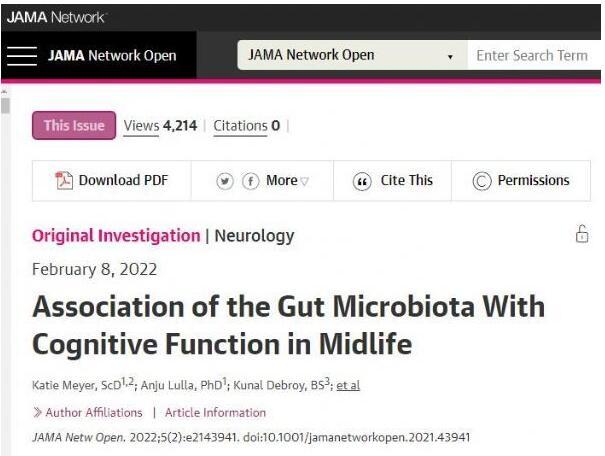 Katie Meyer,ScD1,2;Anju Lulla,PhD1;Kunal Debroy,BS3;et al Association of the Gut Microbiota With Cognitive Function in Midlife,JAMA Network Open(2022).DOI:10.1001/jamanetworkopen.2021.43941